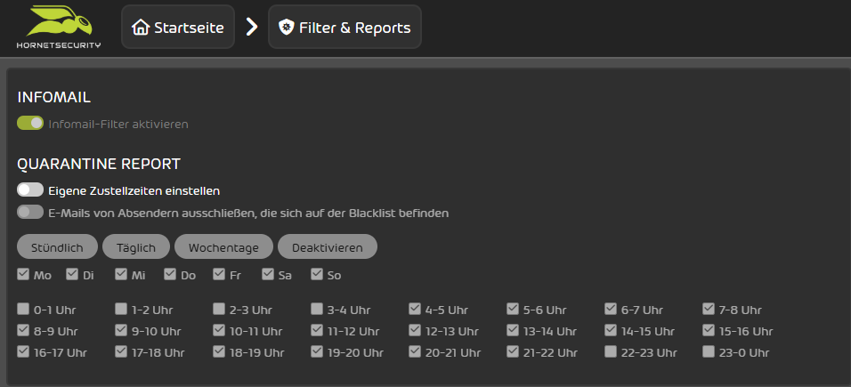 Hier können Benutzer individuelle Einstellungen für Quarantäne-Berichte und Filteroptionen vornehmen.