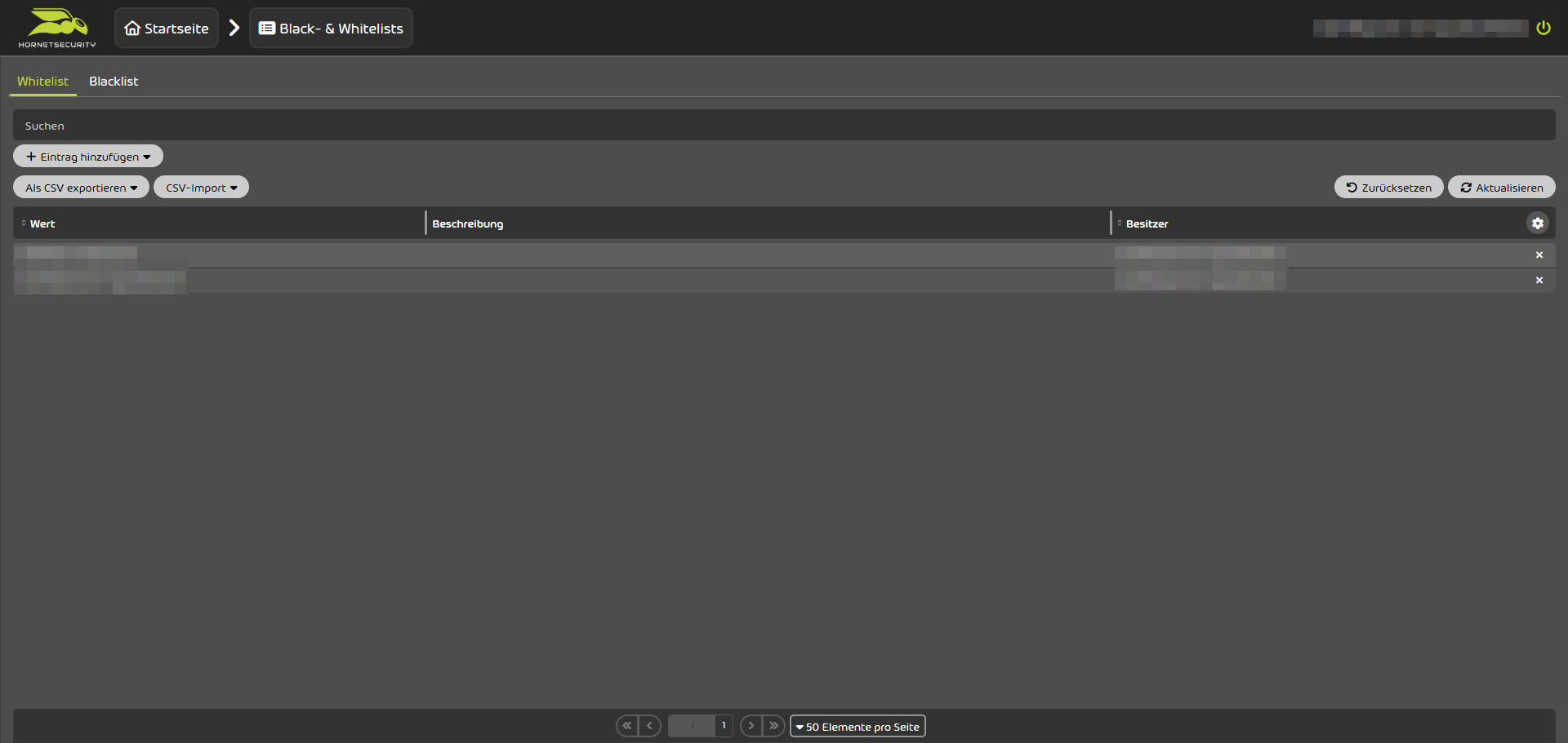 Diese Sektion bietet eine Übersicht über blockierte (Blacklist) und freigegebene (Whitelist) Absender. Neue Einträge können manuell hinzugefügt oder bestehende Einträge bearbeitet werden.