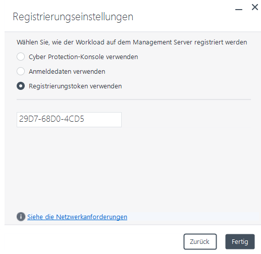 (Passen Sie keinesfalls andere Einstellungen an!) - Wählen Sie "Registrierungstoken verwenden", kopieren Sie das Token (siehe oben) in das Eingabefeld und klicken Sie auf "Fertig".